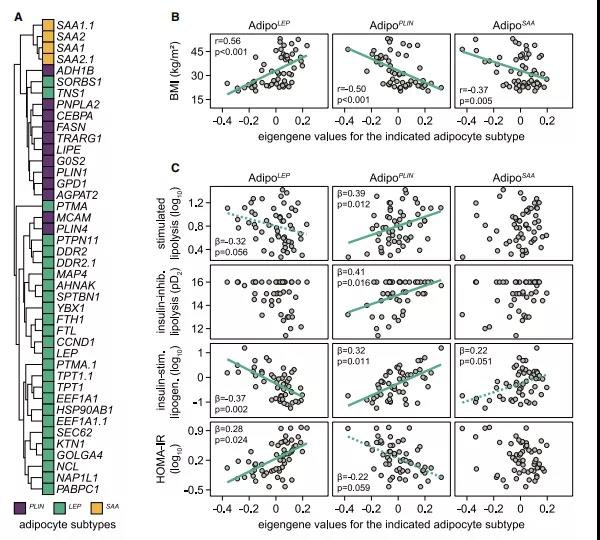 ? ? ? ??接下來(lái),作者的目標(biāo)是了解脂肪細(xì)胞亞型對(duì)組織功能的貢獻(xiàn)。為深入了解脂肪細(xì)胞亞型方面的功能,作者對(duì)56女性的WAT轉(zhuǎn)錄組數(shù)據(jù)進(jìn)行了綜合分析,其中還對(duì)新鮮分離的脂肪細(xì)胞進(jìn)行了脂肪分解/脂肪生成測(cè)量。在比較56名女性數(shù)據(jù)時(shí),Adipo PLIN、Adipo LEP和Adipo SAA標(biāo)記基因形成了單獨(dú)的、共同調(diào)控的集群(圖6A),可用來(lái)確定細(xì)胞類(lèi)型豐度和脂肪細(xì)胞表型之間的關(guān)系。與空間數(shù)據(jù)一致 ,Adipo PLIN在肥胖人群中的比例降低,分析顯示Adipo PLIN與BMI之間負(fù)相關(guān),AdipoSAA與BMI也呈負(fù)相關(guān),而AdipoLEP呈正相關(guān)(圖6B)。