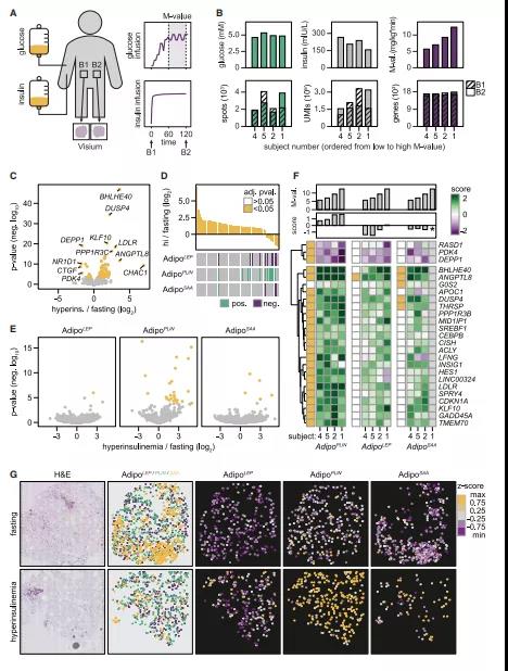 ? ? ? ??在脂肪細(xì)胞中,兒茶酚胺刺激脂肪分解,胰島素抑制脂肪分解促進(jìn)脂肪生成。通過(guò)校正BMI(圖6c),作者觀察到AdipoPLIN和兩種脂解指標(biāo)之間存在正相關(guān),而AdipoLEP與這些參數(shù)沒(méi)有或弱負(fù)相關(guān)。對(duì)于胰島素刺激脂肪生成,研究發(fā)現(xiàn)Adipo PLIN與此指標(biāo)呈正相關(guān),AdipoLEP呈負(fù)相關(guān)。相比之下,AdipoSAA與任何研究參數(shù)均無(wú)顯著相關(guān)性??傊?,這表明Adipo PLIN與AdipoSAA相比,Adipo PLIN與更明顯的胰島素反應(yīng)有關(guān)。為了在人體內(nèi)測(cè)試這一發(fā)現(xiàn),作者在高胰島素-微生物-正血糖鉗夾2小時(shí)后,從10個(gè)個(gè)體中的4個(gè)收集了 WAT樣本,并進(jìn)行了空間轉(zhuǎn)錄組分析(圖7A,7B)。穩(wěn)定狀態(tài)下的胰島素平均濃度是空腹?fàn)顟B(tài)下的10倍,從葡萄糖處理率(m值)可以看出,4例患者均表現(xiàn)出明顯的胰島素敏感性(圖7B)。高胰島素血癥的空間數(shù)據(jù)與禁食狀態(tài)下獲得的樣本質(zhì)量相似(圖7B),兩者的比較在基因表達(dá)水平上明確了胰島素反應(yīng)(圖7C)。這些數(shù)據(jù)與之前報(bào)道的高胰島素鉗夾隊(duì)列的大量組織RNA測(cè)序顯示出一致的結(jié)果,表明空間分析捕捉到了胰島素的急性反應(yīng)。盡管胰島素誘導(dǎo)了一個(gè)快速的轉(zhuǎn)錄反應(yīng),但在這個(gè)時(shí)間框架內(nèi),它本身并不是脂肪細(xì)胞異質(zhì)性的驅(qū)動(dòng)因素(圖7D)。接下來(lái),作者根據(jù)細(xì)胞類(lèi)型進(jìn)行胰島素反應(yīng)分析。對(duì)于脂肪細(xì)胞,在AdipoPLIN中有多個(gè)基因?qū)σ葝u素有顯著反應(yīng),AdipoSAA中變少,而AdipoLEP中只有一個(gè)基因(圖7E)。作者評(píng)估了個(gè)體間對(duì)胰島素的轉(zhuǎn)錄反應(yīng)是否存在數(shù)量差異,分析結(jié)果表明,Adipo PLIN反映了 M-values值,但這在其他兩個(gè)亞型中不明顯(圖7F和7G)??傊?,這些數(shù)據(jù)表明,體內(nèi)對(duì)胰島素的轉(zhuǎn)錄反應(yīng)主要?dú)w因于Adipo PLIN,而其他脂肪細(xì)胞亞型對(duì)高胰島素血癥仍然沒(méi)有反應(yīng)。