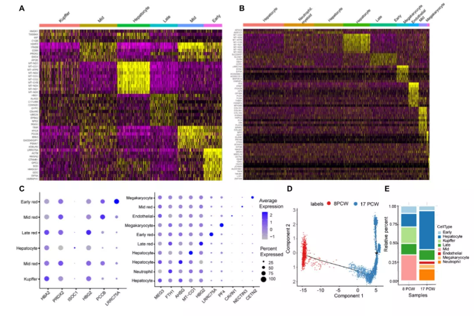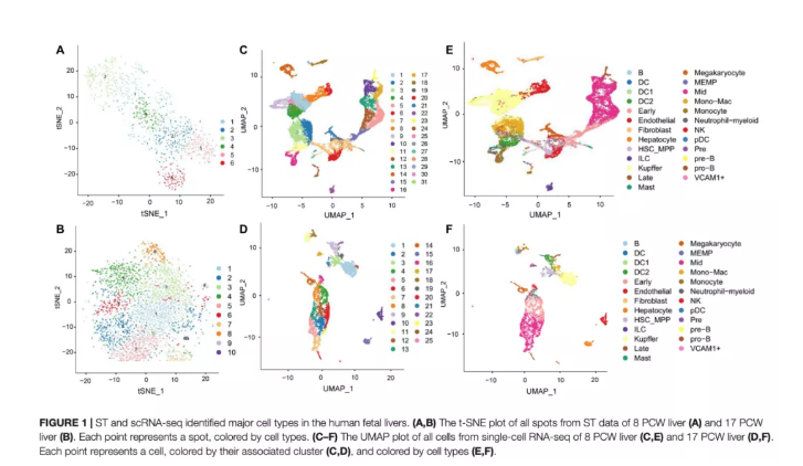 本文中作者結(jié)合了單細(xì)胞RNA測序和空間轉(zhuǎn)錄組學(xué)(ST)技術(shù)的優(yōu)點(diǎn),對人類從受孕后8周(PCW)到17周(PCW)的胎兒肝臟進(jìn)行了分析。系統(tǒng)地鑒定了9種細(xì)胞類型,并確定了主要細(xì)胞類型的發(fā)育途徑。結(jié)果表明,人胎肝在實(shí)驗(yàn)期間經(jīng)歷了血液的快速生長和遷移,并鑒定了紅系細(xì)胞發(fā)育過程中的差異表達(dá)基因和代謝變化。此外,作者還對肝病相關(guān)基因的表達(dá)進(jìn)行了研究,發(fā)現(xiàn)17個已發(fā)表并與肝病相關(guān)的基因主要在巨核細(xì)胞和內(nèi)皮細(xì)胞中表達(dá),在其他細(xì)胞類型中幾乎不表達(dá)??傊?,作者的研究結(jié)果提供了一個全面而清晰的了解人類胚胎肝臟中所有主要細(xì)胞類型的分化過程,這可能為肝臟疾病的治療和肝臟再生提供參考數(shù)據(jù)和信息。
