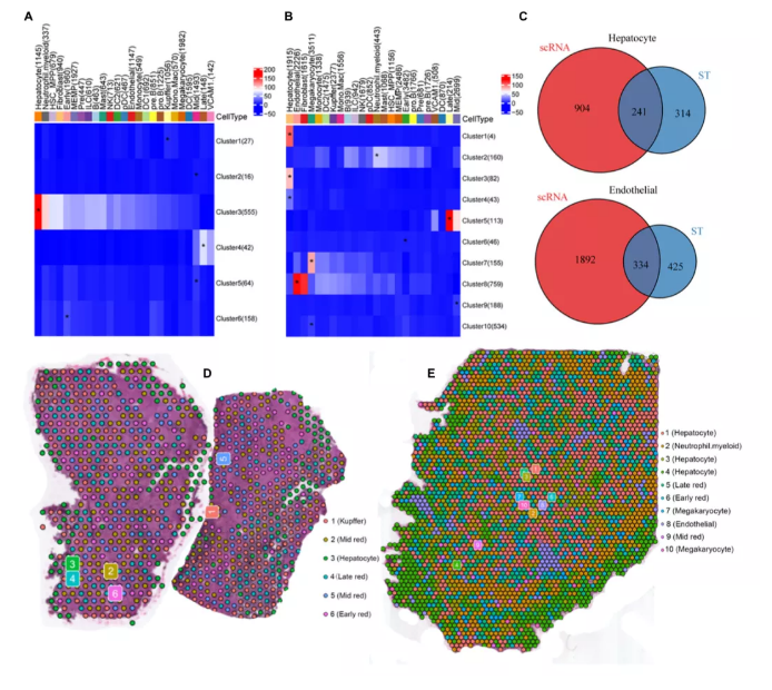人類胎兒肝臟在子宮內(nèi)的發(fā)育至今仍知之甚少。在這項(xiàng)研究中,作者應(yīng)用了一種方法來識別和空間定位胎兒肝組織中不同的細(xì)胞狀態(tài)、亞群和細(xì)胞類型。該方法首先通過scRNA-seq對活組織中存在的cluster和細(xì)胞類型進(jìn)行表征,同時(shí)通過ST鑒定轉(zhuǎn)錄組區(qū)域。通過MIA,可以完美地整合ST數(shù)據(jù)和scRNA-seq數(shù)據(jù),并以無偏的方式分析感興趣區(qū)域的數(shù)據(jù)。