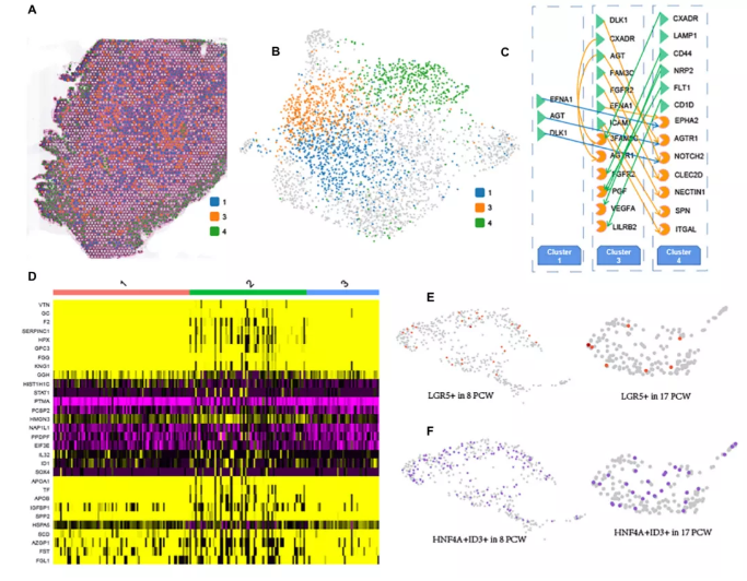 如圖3E所示,肝細(xì)胞是17 PCW肝臟的主要實(shí)質(zhì)細(xì)胞。作者觀察到三個不同的肝細(xì)胞cluster(cluster1、3和4)沿著17周PCW肝臟的空間深度分布(圖4A、B)。作者發(fā)現(xiàn)MEG3、ITIH3和HMGCS1呈cluster1高表達(dá)。FGB、IGFBP1和A2M基因在cluster3中表達(dá)更高,表明區(qū)域DEGs可能參與了相應(yīng)區(qū)域特異性功能的形成。此外,cluster4組中的肝細(xì)胞高表達(dá)數(shù)個基因,包括MT-CO1、MT-CO2、MT-CO3,它們參與線粒體電子傳遞和氧化磷酸化。值得注意的是,cluster1和3主要聚集在肝組織的中心區(qū)域,cluster4主要聚集在肝的周圍區(qū)域(圖4a)。差異表達(dá)分析的熱圖顯示肝細(xì)胞分化過程中逐漸下調(diào)或上調(diào)的基因。GO分析表明,1-3-4cluster中逐漸上調(diào)的基因主要與細(xì)胞極性通路、Wnt信號通路和GTPase活性的調(diào)節(jié)有關(guān),而逐漸下調(diào)的基因則參與壞死細(xì)胞死亡、糖原生物合成過程的調(diào)節(jié),肝臟再生。此外,作者描述了cluster1-3-4細(xì)胞之間的細(xì)胞通訊(圖4C),為將來的研究提供了潛在的信號轉(zhuǎn)導(dǎo)信息。值得注意的是,盡管cluster3和cluster1的距離更近,但cluster3與cluster4細(xì)胞的信號轉(zhuǎn)導(dǎo)比cluster1細(xì)胞更為顯著。此外,作者還發(fā)現(xiàn)了一些共享的和活躍的配體-受體對,如DLK1-NOTCH2、EFNA1EPHA2、AGT-AGTR1,這些配體-受體對既存在于cluster1細(xì)胞與cluster4細(xì)胞的細(xì)胞通訊中,也存在于cluster3細(xì)胞與cluster4細(xì)胞的細(xì)胞通訊中。