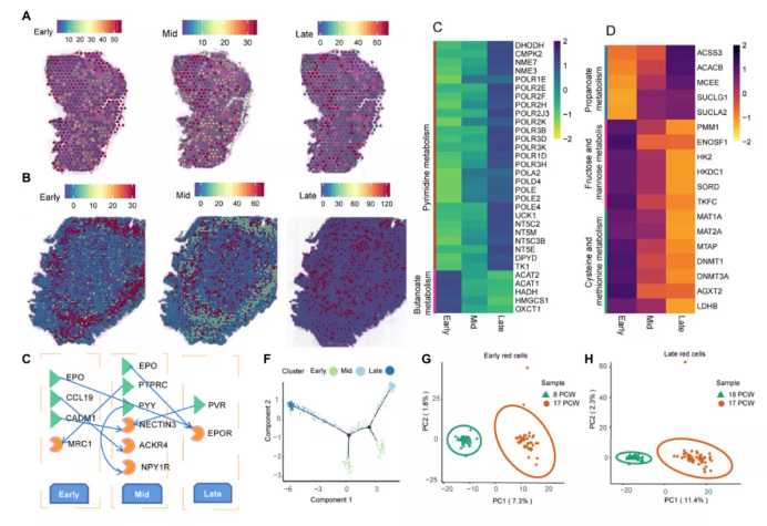 在8PCW肝臟中,小的紅細(xì)胞簇散布在整個肝臟中(圖5A)。在17PCW肝臟中,肝臟充滿了紅細(xì)胞,并且完全變紅(圖5b)。值得注意的是,早期的紅細(xì)胞位于肝組織的外圍,而中期紅細(xì)胞和晚期紅細(xì)胞則分散在肝組織的中心區(qū)域(圖5B)。這一戲劇性的形態(tài)學(xué)變化表明,在實(shí)驗(yàn)研究期間,人類胎兒肝臟都經(jīng)歷了血液的快速生長和遷移。在8和17PCW肝中均有早、中、晚期成紅細(xì)胞。為了研究紅細(xì)胞的發(fā)育過程,作者研究了這三種類型紅細(xì)胞間差異表達(dá)的基因。在8PCW肝臟中,818個基因在早、晚分化過程中逐漸下調(diào),2648個基因在早、晚分化過程中逐漸上調(diào)。逐漸上調(diào)的基因富含乙醛酸和二羧酸代謝、嘧啶代謝、果糖和甘露糖代謝、丙酮酸代謝和嘌呤代謝,而逐漸下調(diào)的基因與丁酸代謝相關(guān)(圖5C)。在17PCW肝組織中,有812個基因在分化早期、中晚期逐漸下調(diào),880個基因在分化早期、中晚期逐漸上調(diào)。