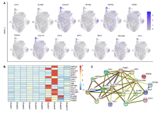 為了進(jìn)一步揭示這一現(xiàn)象,作者分析了這17種肝病相關(guān)基因在17PCW胚胎腎臟中的表達(dá)水平。除PECAM1外,其余基因在17PCW腎中表達(dá)。但其表達(dá)模式與肝臟不同,主要不在巨核細(xì)胞和內(nèi)皮細(xì)胞中表達(dá),說明這些肝病相關(guān)基因在胚胎肝臟中具有獨(dú)特的基因表達(dá)模式。此外,對這17個肝病相關(guān)基因的蛋白質(zhì)相互作用網(wǎng)絡(luò)分析顯示TGFB1、COL1A1、SPP1、PECAM1和THBS1在表達(dá)網(wǎng)絡(luò)中起關(guān)鍵作用,而PDE5A與其他基因沒有相互作用(圖6C)。