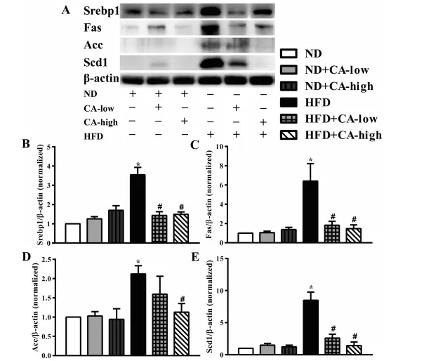 3.補充CA可調(diào)節(jié)高脂喂養(yǎng)小鼠脂肪生成相關(guān)蛋白表達(dá)