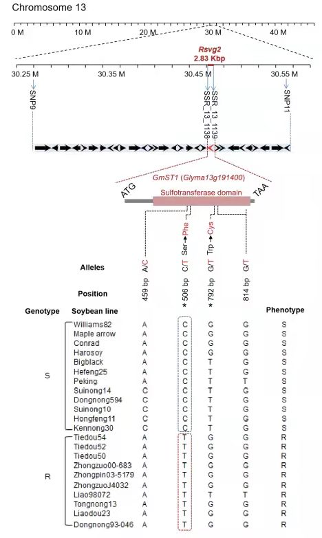 大豆[Glycine max(L.)Merr。]是一種在世界范圍內(nèi)種植的重要油料作物,是人類豐富的植物油和蛋白質(zhì)來(lái)源。但許多病原體優(yōu)先攻擊大豆。這些攻擊導(dǎo)致嚴(yán)重的產(chǎn)量損失和質(zhì)量下降。在全世界攻擊大豆的病原體中,大豆花葉病毒(SMV)是通過(guò)蚜蟲(chóng)和感染的種子非持久性傳播的,是最廣泛和破壞性最大的疾病之一。SMV感染通常會(huì)使大豆產(chǎn)量降低10–30%,但在嚴(yán)重暴發(fā)時(shí),損失可能達(dá)到50–100%。根據(jù)大豆品種中SMV感染的癥狀,包括典型的葉片圖案,葉片變形,植物發(fā)育不良,頂部壞死和種子斑點(diǎn),將SMV菌株分為7種主要致病型:G1-G7。由于種子的可傳播性,所有主要大豆生產(chǎn)國(guó)都存在菌株致病型(G1-G7)。目前,有4個(gè)主要的SMV抗性基因座(Rsv1,Rsv3,Rsv4和Rsv5),大豆基因組的可用性加快了分子標(biāo)記的開(kāi)發(fā)和Rsv基因座候選基因的鑒定。最主要的Rsv1基因座是最復(fù)雜的,它包含編碼NBS-LRR蛋白的基因簇,這個(gè)染色體區(qū)域還攜帶多種病原體抗性基因,一大類同源NBS-LRR序列聚集在Rsv1基因座上,據(jù)推測(cè),DNA的兩個(gè)片段分別是3gG2(Glyma.13g190800的等位基因)和5gG3(Glyma.13g190000的等位基因),是Rsv1的最可能的候選基因,針對(duì)Rsv3,Rsv4也進(jìn)行了相關(guān)的研究。盡管針對(duì)每個(gè)Rsv基因座篩選了候選基因,但除了Rsv4以外,沒(méi)有一個(gè)關(guān)鍵基因被完全闡明。本研究中使用重組自交系RIL群體和F2分離群體,確定并精細(xì)繪制了SMV抗性基因座Rsvg2;分離候選基因的同時(shí),使用表達(dá)分析和遺傳轉(zhuǎn)化測(cè)定法驗(yàn)證了其功能。最終發(fā)現(xiàn),Rsvg2編碼磺基轉(zhuǎn)移酶(SOT),GmST1,與AtSOT15(AT5G07010)同源,為大豆對(duì)SMV的抗性提供了新的可能解釋。
