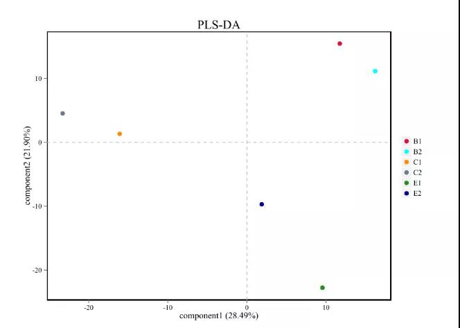 偏最小二乘判別分析(Partialleast squares discriminant analysis,PLS-DA)是多變量數(shù)據(jù)分析技術(shù)中的判別分析法,經(jīng)常用來(lái)處理分類(lèi)和判別問(wèn)題。通過(guò)對(duì)主成分適當(dāng)?shù)男D(zhuǎn),PLS-DA可以有效的對(duì)組間觀察值進(jìn)行區(qū)分,并且能夠找到導(dǎo)致組間區(qū)別的影響變量。PLS-DA采用了經(jīng)典的偏最小二乘回歸模型,其響應(yīng)變量是一組反應(yīng)統(tǒng)計(jì)單元間類(lèi)別關(guān)系的分類(lèi)信息,是一種有監(jiān)督的判別分析方法。因無(wú)監(jiān)督的分析方法(PCA)對(duì)所有樣本不加以區(qū)分,即每個(gè)樣本對(duì)模型有著同樣的貢獻(xiàn),因此,當(dāng)樣本的組間差異較大,而組內(nèi)差異較小時(shí),無(wú)監(jiān)督分析方法可以明顯區(qū)分組間差異;而當(dāng)樣本的組間差異不明晰,而組內(nèi)差異較大時(shí),無(wú)監(jiān)督分析方法難以發(fā)現(xiàn)和區(qū)分組間差異。另外,如果組間的差異較小,各組的樣本量相差較大,樣本量大的那組將會(huì)主導(dǎo)模型。有監(jiān)督的分析(PLS-DA)能夠很好的解決無(wú)監(jiān)督分析中遇到的這些問(wèn)題。