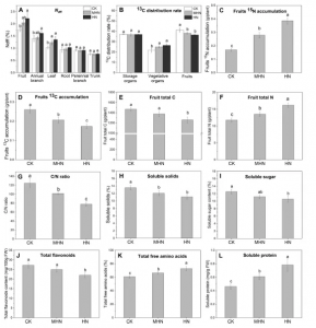 實(shí)驗(yàn)材料:紅富士蘋果(7齡;中國東北部山東省煙臺(tái)市)。對(duì)照組CK:正常尿素處理組(300 kg N/hm2,每棵樹435 g尿素);實(shí)驗(yàn)組MHN:中高氮處理組(600 kg N/hm2,每棵樹870 g尿素);實(shí)驗(yàn)組HN:高氮處理組(800 kg N/hm2,每棵樹1160 g尿素)。在開花后183天進(jìn)行13C標(biāo)記。