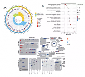 共獲得5340個(gè)蛋白質(zhì),與對(duì)照相比,795個(gè)DEPs在HN中顯示出顯著變化,其中422個(gè)蛋白上調(diào),373個(gè)蛋白下調(diào)。GO富集分析顯示氧化作用?還原過程和應(yīng)激反應(yīng)富含更多的蛋白質(zhì),而下調(diào)的蛋白質(zhì)富集程度更高(圖3A)。KEGG分析發(fā)現(xiàn)C代謝、丙酮酸代謝、糖酵解/糖異生、三羧酸(TCA)循環(huán)、次級(jí)代謝產(chǎn)物生物合成和氨基酸生物合成途徑顯著富集(圖3B)。MapMan分析結(jié)果顯示許多DEP參與主要和次要CHO代謝、糖酵解、TCA循環(huán)、氨基酸代謝和次級(jí)代謝,并且大多數(shù)這些蛋白質(zhì)被發(fā)現(xiàn)下調(diào)(圖3C)。