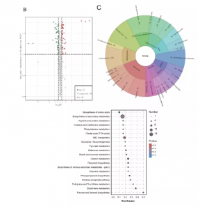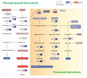 共鑒定到36個(gè)上調(diào)代謝物和47個(gè)下調(diào)代謝產(chǎn)物(圖4B),包括類黃酮,碳水化合物、氨基酸和衍生物等(圖4C)。KEGG富集分析表明差異代謝物(DAMs)主要在氨基酸生物合成、次生代謝產(chǎn)物生物合成、C代謝和類黃酮生物合成富集。碳水化合物中D-果糖6-磷酸和Dglucono-1,5-內(nèi)酯的下調(diào)倍數(shù)最大,氨基酸和衍生物中,有四種下調(diào),六種上調(diào),其中高精氨酸的上調(diào)倍數(shù)最大。此外,結(jié)果還表明果實(shí)中積累的黃酮類化合物較少,且氮含量較高,尤其是鼠李素-3-O-蘆丁苷和蘆丁。