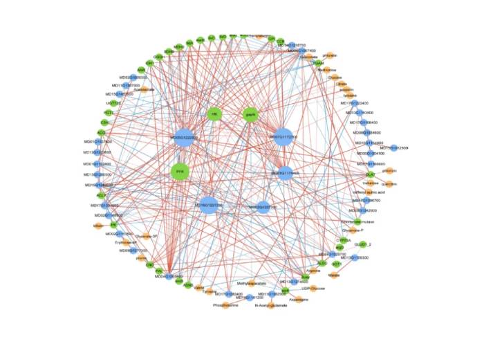 基于Pearson相關(guān)分析(系數(shù)>0.9,P<0.05),篩選與初級(jí)代謝和次級(jí)代謝相關(guān)的基因、蛋白質(zhì)和代謝物(圖7)。獲得5個(gè)hub基因和3個(gè)hub蛋白,其中MD07G1172700(編碼PAL)包含在次級(jí)代謝中,MD05G1222800(編碼argD)、MD16G1227200(編碼leuC)、MD01G1174400(編碼GLUD1_2)、MD02G1207200(編碼tktA)、PFK、gapN,而HK則包含在初級(jí)代謝中。這些hub基因和蛋白質(zhì)之間存在著相對(duì)較多的正相關(guān)節(jié)點(diǎn)。