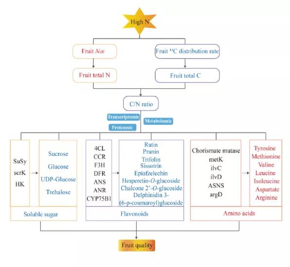 高氮增加了果實(shí)對(duì)15N的吸收和調(diào)節(jié)能力,降低了C在果實(shí)中的分配率,從而導(dǎo)致蘋果果實(shí)的總N增加,總C和C/N比率降低。高氮破壞了蘋果C?N平衡,降低了蘋果果實(shí)的可溶性糖和總黃酮含量,進(jìn)而使果實(shí)品質(zhì)惡化。基于多組學(xué)分析,揭示了高氮對(duì)初級(jí)代謝和次級(jí)代謝互作網(wǎng)絡(luò)。高氮調(diào)節(jié)了蘋果果實(shí)中基因和蛋白質(zhì)的表達(dá),抑制了碳水化合物和黃酮類化合物的積累,更多的碳骨架被用來合成氨基酸及其衍生物并轉(zhuǎn)移到氮代謝中。本研究揭示了高氮導(dǎo)致蘋果果實(shí)糖和類黃酮含量下降的機(jī)理,并獲得了關(guān)鍵候選基因和蛋白質(zhì)。