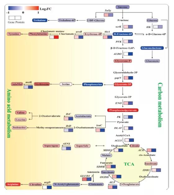 C代謝包括淀粉和蔗糖代謝、糖酵解和TCA循環(huán)。高氮總體下調(diào)了C代謝中蛋白質(zhì)(Susy、scrK和HK)的豐度和碳水化合物(蔗糖、葡萄糖和海藻糖)的積累。相反,糖酵解中間產(chǎn)物卻明顯積累,如甘油-P、甘油酸-3P和磷酸烯醇式丙酮酸。這表明蛋白質(zhì)(ALDO、gapN和ENO)與這些中間代謝物之間存在負(fù)相關(guān)。糖酵解亞型的增加表明,高氮加速了C在呼吸途徑中的流動(dòng)。氨基酸與碳代謝密切相關(guān),是氮分配的主要形式。氨基酸生物合成途徑中的大多數(shù)蛋白質(zhì)表達(dá)下調(diào)(脊索酸變位酶除外),而大多數(shù)氨基酸及其中間產(chǎn)物表達(dá)上調(diào)(圖5)。以前的研究表明,隨著氮供應(yīng)的增加,非結(jié)構(gòu)性碳水化合物中的一部分C被并入氨基酸和蛋白質(zhì)中。以氨基酸形式的氮增加,使氮儲(chǔ)存更具成本效益。因此,C向N代謝的轉(zhuǎn)移是導(dǎo)致高氮條件下碳水化合物減少的一個(gè)重要因素,這使得水果中氨基酸和總氮含量的顯著增加。甘油酸-3P和磷酸烯醇式丙酮酸的增加是氨基酸生物合成所需C骨架增加的重要指標(biāo)。