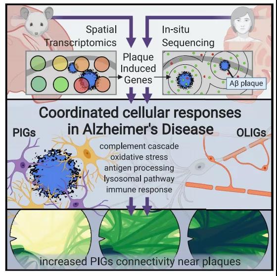 本研究利用空間轉(zhuǎn)錄組對AD小鼠模型中淀粉樣斑塊組織區(qū)域進行研究,發(fā)現(xiàn)了斑塊誘導的基因(PIGs)注釋到氧化應激和炎癥等相關通路上。此外通過對小鼠和人腦切片進行原位測序(ISS),證實了基因的變化。因此,空間轉(zhuǎn)錄組測序為探究AD相關腦部組織致病特征提供了可能。