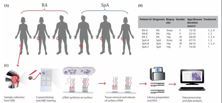 類風濕性關節(jié)炎(RA)和脊椎關節(jié)炎(SpA)是常見的慢性炎癥性疾病,其特征是關節(jié)發(fā)炎,兩種疾病中炎癥關節(jié)的特征是白細胞浸潤以及間充質(zhì)細胞的局部增殖。臨床上,RA和SpA被認為是復雜的自身免疫性疾病。目前對炎癥通路的理解主要基于對滑液和滑膜活檢材料的研究,但它們都顯示出高度的細胞組成異質(zhì)性,因此免疫組化(IHC)是活檢研究的changyong方法。然而,近年來轉(zhuǎn)錄組學已發(fā)展成為研究混合成分細胞調(diào)節(jié)分子途徑的一種更常見的方法,特別是單細胞轉(zhuǎn)錄組,這些方法雖然獲得的信息量大,但主要集中在來自同質(zhì)化組織或單細胞懸浮液的細胞,并沒有揭示疾病病灶的空間信息。