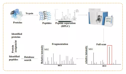 蛋白質(zhì)質(zhì)譜鑒定的基本原理是用蛋白酶將蛋白質(zhì)消化成肽段混合物,經(jīng)MAILDI或ESI等軟電離手段將其離子化,然后通過質(zhì)量分析器將具有特定質(zhì)核比的肽段離子分離開來。通過實(shí)際譜圖和理論上蛋白質(zhì)經(jīng)過蛋白酶消化后產(chǎn)生的一級(jí)質(zhì)譜峰圖和二級(jí)質(zhì)譜峰圖進(jìn)行的比對(duì),進(jìn)行蛋白鑒定。