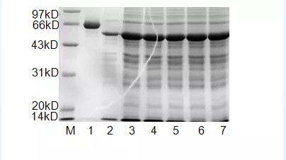 M: marker 1:0.5 mg/ml BSA(上樣量10 μL)2:0.5 mg/ml 目的蛋白溶液(上樣量2 μL) 3-7:0.5 mg/ml 目的蛋白溶液(上樣量10μL)