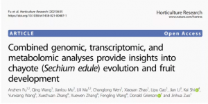 主要內(nèi)容:本研究通過Nanopore技術(shù)首次完成高質(zhì)量的佛手瓜基因組,基因組組裝大小為606.42Mb,ContigN50=8.4 Mb。并基于Hi-C技術(shù)將基因組序列掛載至14條染色體上(掛載率97.04%)。通過與其他13個(gè)物種基因家族比較,發(fā)現(xiàn)佛手瓜在25±4百萬年間發(fā)生了一次全基因組復(fù)制事件,是葫蘆科內(nèi)的第三次全基因組復(fù)制事件。通過不同生長(zhǎng)時(shí)期的轉(zhuǎn)錄組與代謝組分析,進(jìn)一步揭示了在佛手瓜果實(shí)發(fā)育過程中與果實(shí)質(zhì)地、色素、風(fēng)味、類黃酮、抗氧化劑和植物激素有關(guān)的基因。并據(jù)此構(gòu)建了佛手瓜果實(shí)生長(zhǎng)發(fā)育調(diào)控模型,并為佛手瓜果實(shí)和塊莖發(fā)育以及遺傳改良的未來研究奠定了基礎(chǔ)。