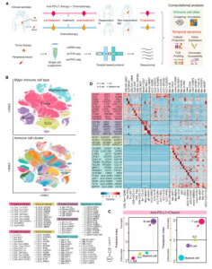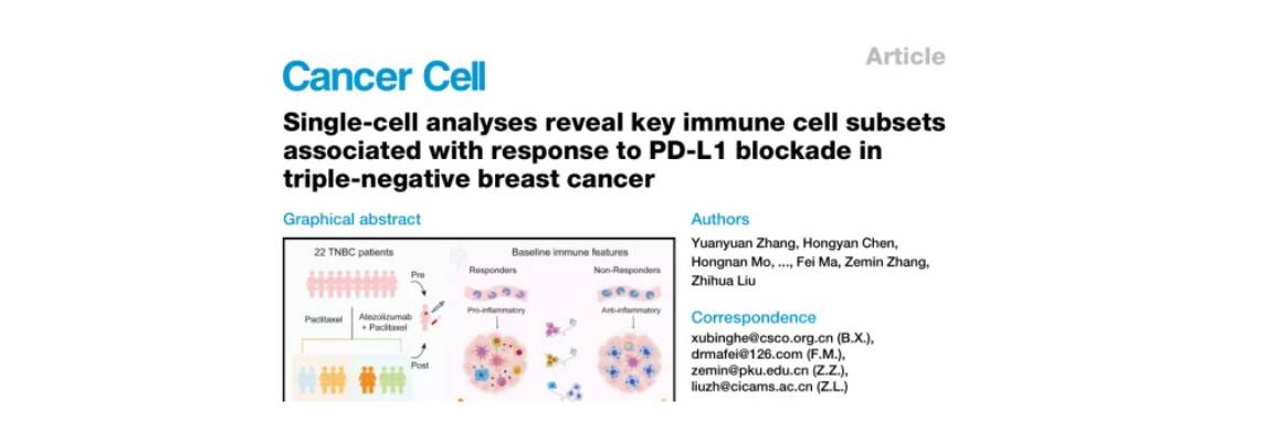 2021年10月14日,中國醫(yī)學科學院腫瘤醫(yī)院聯(lián)合北京大學生物醫(yī)學前沿創(chuàng)新中心在國際期刊Cancer Cell上在線發(fā)表了題為“Single-cell analyses reveal key immune cell subsets associated with response to PD-L1 blockade in triple negative breast cancer”的研究論文,該團隊結(jié)合單細胞RNA- seq、TCR-seq和ATAC-seq等技術,研究紫杉醇(paclitaxel,化療)聯(lián)合anti-PD-L1抗體阿替利珠單抗(atezolizumab 免疫治療)治療TNBC(三陰性乳腺癌)患者腫瘤微環(huán)境和外周血中的免疫細胞動力學,揭示應答者和無應答者的免疫特征,紫杉醇化療聯(lián)合阿替利珠單抗免疫治療在TNBC治療中的機制和相互作用。