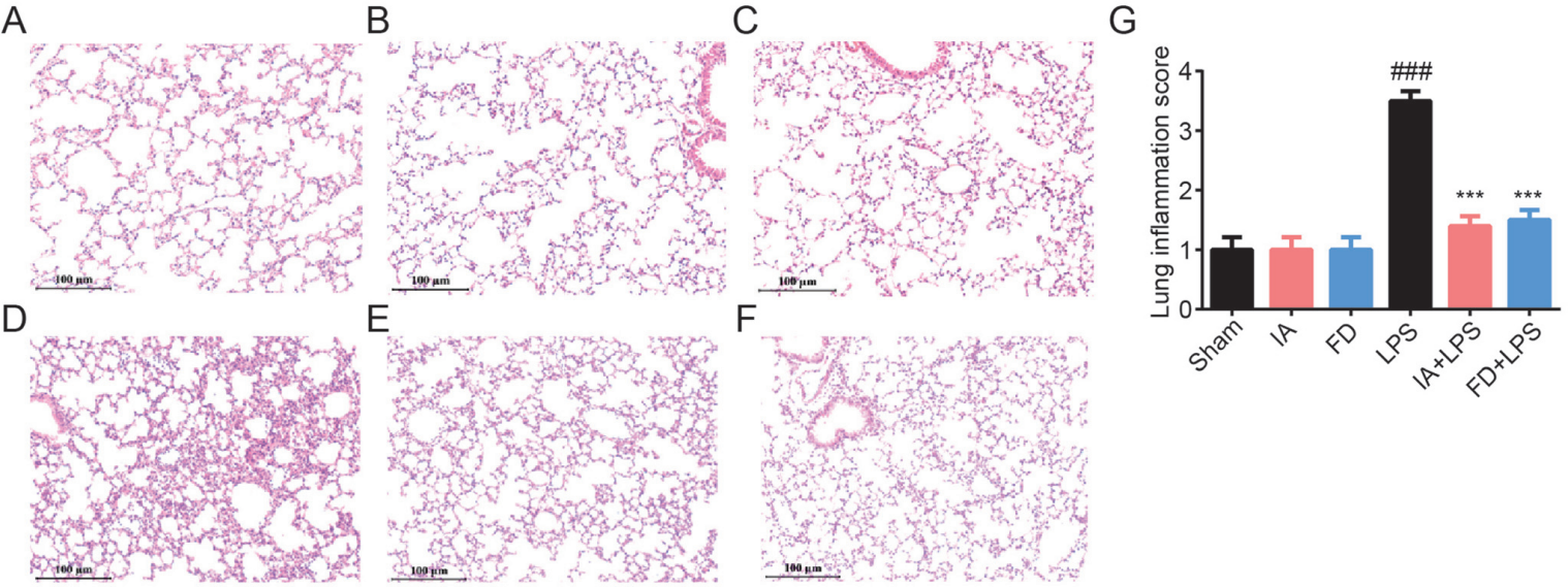 特定無菌C57BL/L的成年小鼠,隨機分為6組:①Sham(注射磷酸緩沖鹽水,自由喝水),②FD(注射磷酸緩沖鹽水,自由喝康普茶),③IA(注射磷酸緩沖鹽水,康普茶灌胃100 μL/100g,每天),④LPS(注射LPS誘導膿毒癥,自由喝水),⑤FD+LPS(注射LPS誘導膿毒癥,自由喝康普茶),⑥IA+LPS(注射LPS誘導膿毒癥,康普茶灌胃100 μL/100g,每天)。