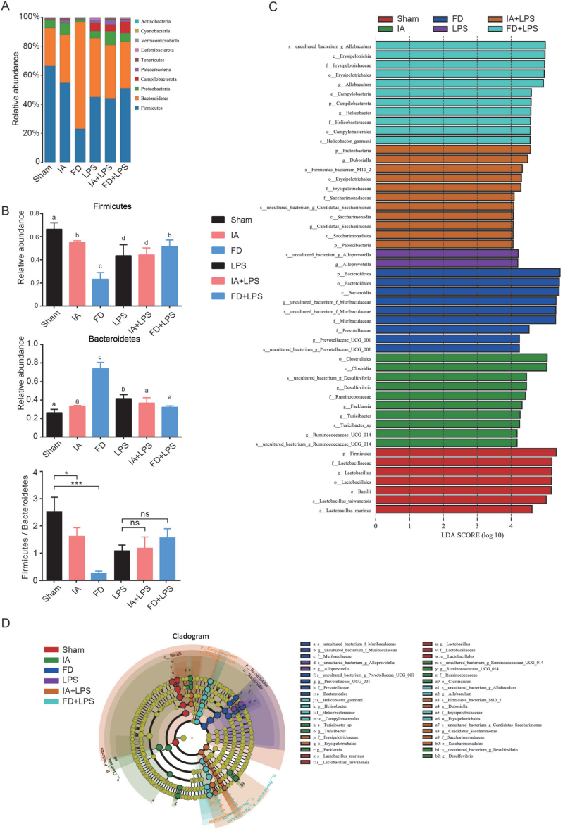 康普茶攝入對小鼠腸道微生物門水平分布產(chǎn)生了影響,不同組小鼠的腸道微生物群不同:在Sham組,乳酸桿菌屬為生物標志物;在IA組中,彎曲桿菌屬、法克蘭菌屬、瘤胃球菌科和脫硫弧菌屬是生物標志物;在FD組中,普雷沃氏菌科屬和未培養(yǎng)的細菌屬為生物標志物。異種桿菌屬是LPS組的生物標志物,F(xiàn)D+LPS組是幽門螺桿菌、白桿菌和真桿菌,杜博西菌和念糖菌是IA+LPS組的生物標志物。