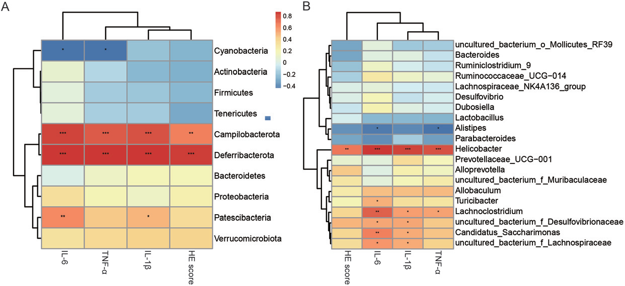 計算6組間差異,評價IL-1β、IL-6、TNF-α和HE評分對微生物群組合的影響。去鐵桿菌門與IL-6、IL-1β、TNF-α和HE評分呈正相關,相關系數(shù)分別為0.852(p<0.001)、0<0.852(p<0.001)、0.843(p<0.001)和0.852(p<0.001)。藍細菌門的豐度與IL-6(r=0.523,p<0.05)和TNF-α(r=0.520,p<0.05)呈負相關。在屬水平上,幽門螺桿菌與IL-6、IL-1β、TNF-α和HE評分呈正相關,相關系數(shù)分別為0.816(p<0.001)、0.776(p<0.001)、0.749(p<0.001)和0.635(p<0.01)。12B)。蛛網(wǎng)膜梭狀芽孢桿菌與IL-1β、IL-6和TNF-α也呈正相關,相關系數(shù)分別為0.700(p<0.01)、0.515(p<0.05)和0.509(p<0.05)。而腐爛別樣桿菌與IL-6和TNF-α呈負相關,相關系數(shù)分別為0.482(p<0.05)和0.517(p<0.05)。