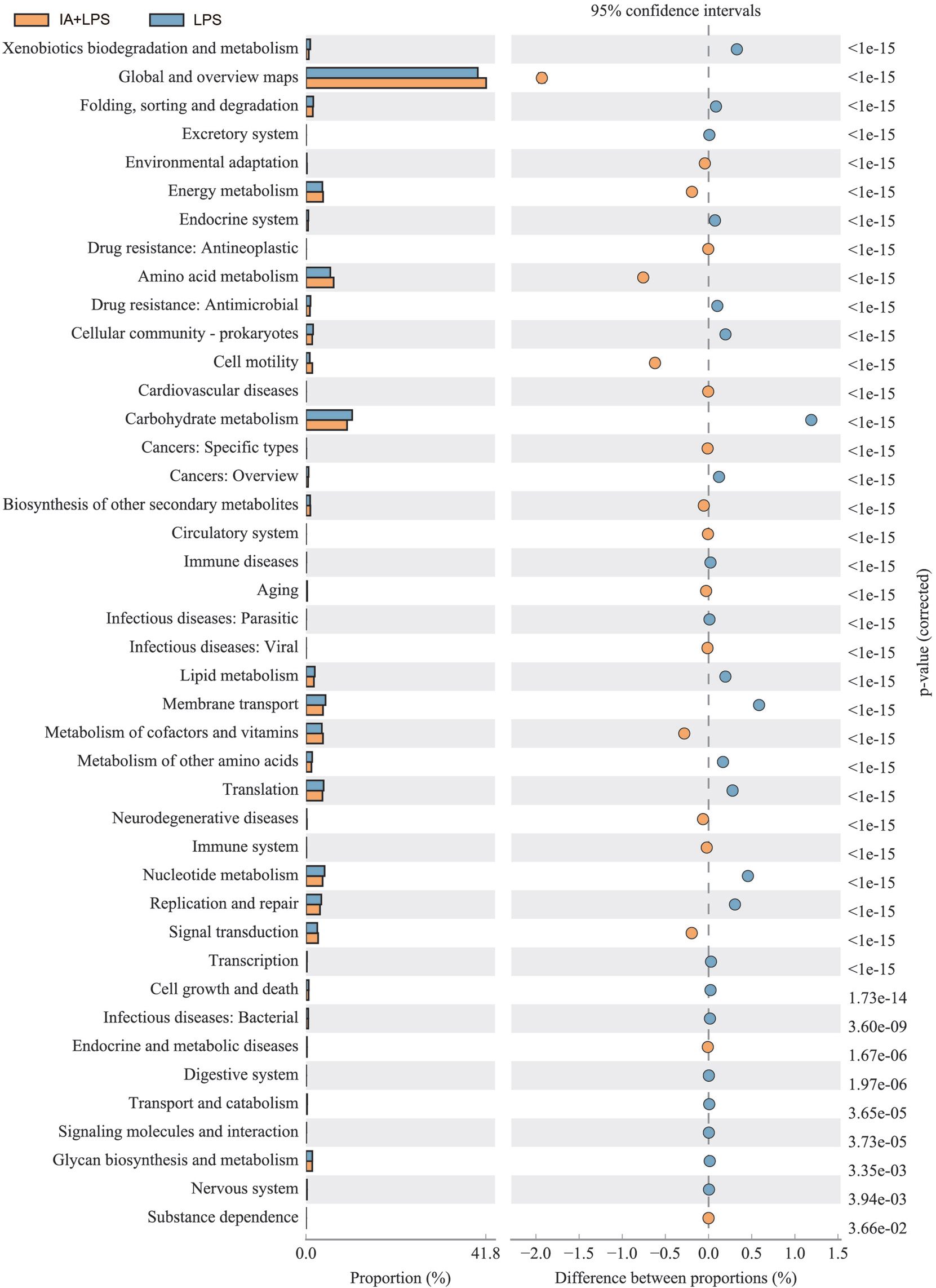 預測IA和IA+LPS組的功能基因,1343條顯著差異通路,其中“全局和概述”、“碳水化合物代謝”、“氨基酸代謝”、“能量代謝”、“輔助因子和維生素代謝”、“膜運輸”、“核苷酸代謝”、“翻譯”、“復制修復”、“信號轉導”的平均比例高,且都是顯著代謝途徑(p<0.05)。