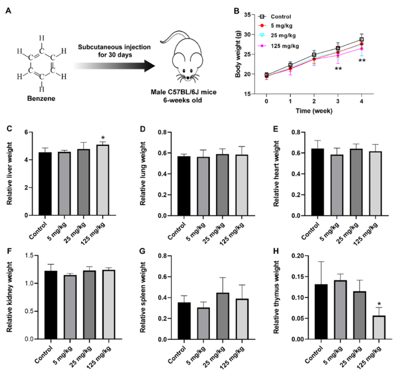 圖1. 暴露30天后苯對小鼠的總體毒性(每組n=6)。