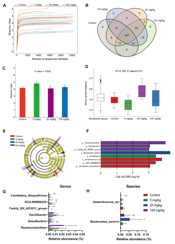 采集的新鮮盲腸內(nèi)容物進行16S rRNA基因測序分析,結果表明,各組的Shannon曲線趨于飽和,表明測序數(shù)據(jù)的數(shù)量和深度足以反映大部分微生物信息(圖3A)。在Venn圖中顯示了四組中共有和特有的OTUs(圖3B)。在本研究中,433個OTU中有307個是所有組共有的。接觸苯組和對照組之間的alpha多樣性并沒有導致微生物群落的差異(圖3C)。值得注意的是,beta多樣性結果顯示,暴露苯組和對照組的植物區(qū)系組成和分布有顯著差異(圖3D)。通過LEfSe分析,在暴露于苯的小鼠和對照小鼠盲腸內(nèi)容物中共鑒定出8個腸道微生物群,這些差異微生物群的相對豐度主要反映在屬和種水平上的變化(圖3E-F)。在屬水平,與對照相比,125 mg/kg苯暴露組中Ruminiclostridium, Desulfovibrio 和 Family_-XIII_AD3011_group,5 mg/kg苯暴露組的Oscil-libacter相對豐度顯著提高;而GCA-900066225和Candidatus_stoquefichus的豐度則顯著降低(圖4G)。在種水平,25 mg/kg苯暴露組Bacteroides_sartorii的豐度高于對照組,Anaerotruncus_sp的豐度呈相反的趨勢(圖4H)。