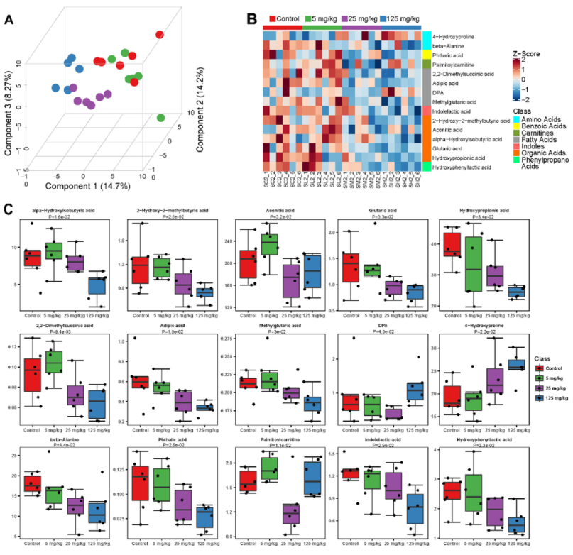 使用絕對定量代謝組學研究了苯暴露30天后血漿代謝物的差異變化。如圖4A所示,成功建立了PLS-DA模型,相似樣本聚集顯著。同時,分別用PLS-DA和Mann-Whitney U檢驗計算VIP值和P值。采用UPLC-MS/MS共鑒定了209種血漿代謝物,15種不同代謝物。在VIP>1和P<0.05閾值下,苯暴露小鼠與對照組之間的潛在生物標記物為羥基苯基乳酸),這些代謝物主要來自有機酸、脂肪酸、氨基酸、苯甲酸、肉堿、吲哚和苯丙酸(圖4B和表S2)。15種不同代謝物的劑量效應關系如圖4C所示。
