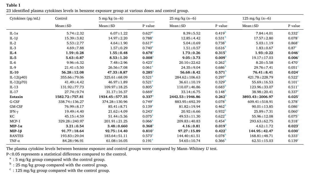 表一.測定不同劑量苯暴露組和對照組23種血漿細胞因子水平