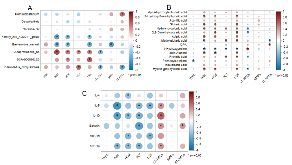 (A) 不同腸道菌群與造血損傷的相關性。(B)差異代謝物與造血損傷的相關性。(C)不同細胞因子與造血損傷的相關性。* P < 0.05。