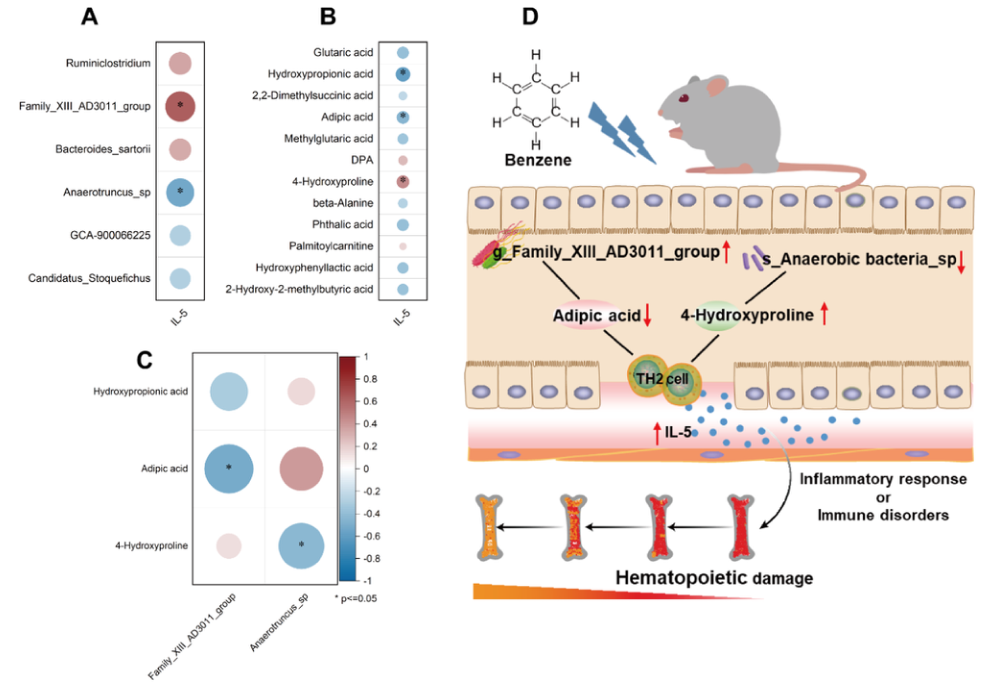 前人文獻表明TH2細胞分泌和產(chǎn)生了上調的細胞因子(如IL-4、IL-5和IL-10),并在機體中發(fā)揮重要的免疫作用。IL-5在苯暴露組和對照組表現(xiàn)出顯著的劑量-反應關系,與造血損傷呈極顯著負相關。分析表明與IL-5與Family_XIII_AD3011_group呈顯著負相關,與Anaerotruncus_sp呈正相關(圖6A)。此外,羥丙酸和己二酸與IL-5呈負相關,而4-羥脯氨酸與IL-5呈正相關(圖6B),F(xiàn)amily_XIII_AD3011_group和Anaerotruncus_sp的豐度變化分別與己二酸和4-羥脯氨酸呈顯著負相關。綜上所述,F(xiàn)amily_XIII_AD3011_group和Anaerotruncus_sp可能調節(jié)了已二酸和4-羥脯氨酸的產(chǎn)生水平,這些代謝產(chǎn)物進一步激活TH2細胞大量分泌IL-5,引起促炎反應或免疫紊亂(圖6D)。這可能是苯誘導造血毒性的初步潛在機制,有待進一步研究證實。