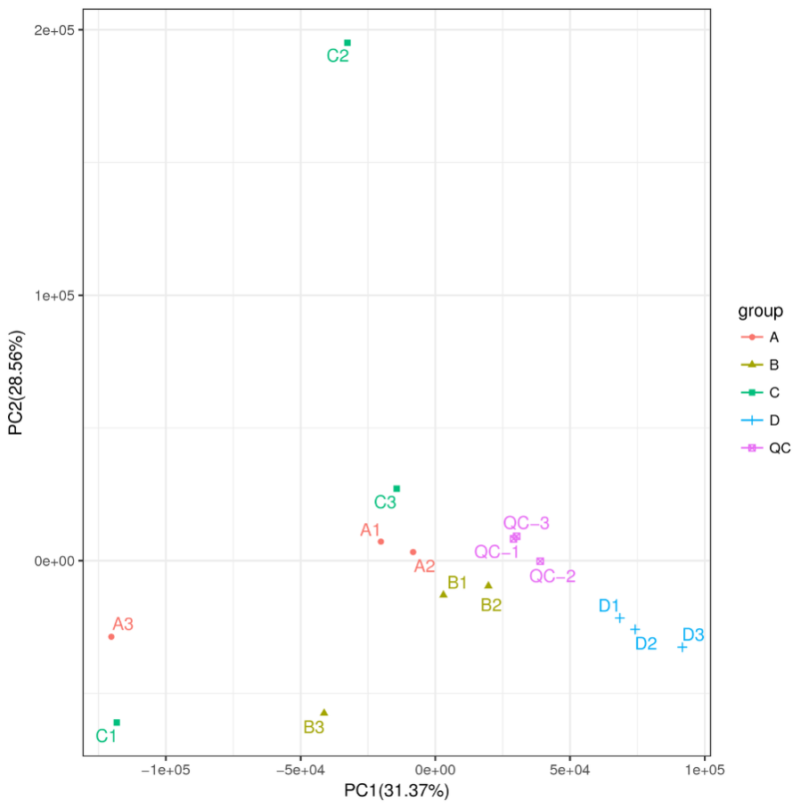 PCA圖現(xiàn)在用形狀和顏色區(qū)分更多的組,一眼就可看到組內(nèi)和組間的代謝模式差別和聚類結(jié)果。同時顯示QC樣本,通過QC更能直觀的儀器的穩(wěn)定性。