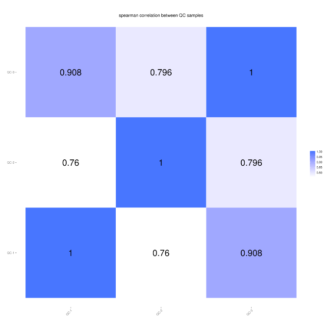 此外,新增QC樣本間的相關(guān)性, 通過計算QC樣品之間的相關(guān)性分析可以評估下機(jī)數(shù)據(jù)整體質(zhì)量,一般認(rèn)為QC樣本間相關(guān)性>0.75時,數(shù)據(jù)質(zhì)量較為可靠。