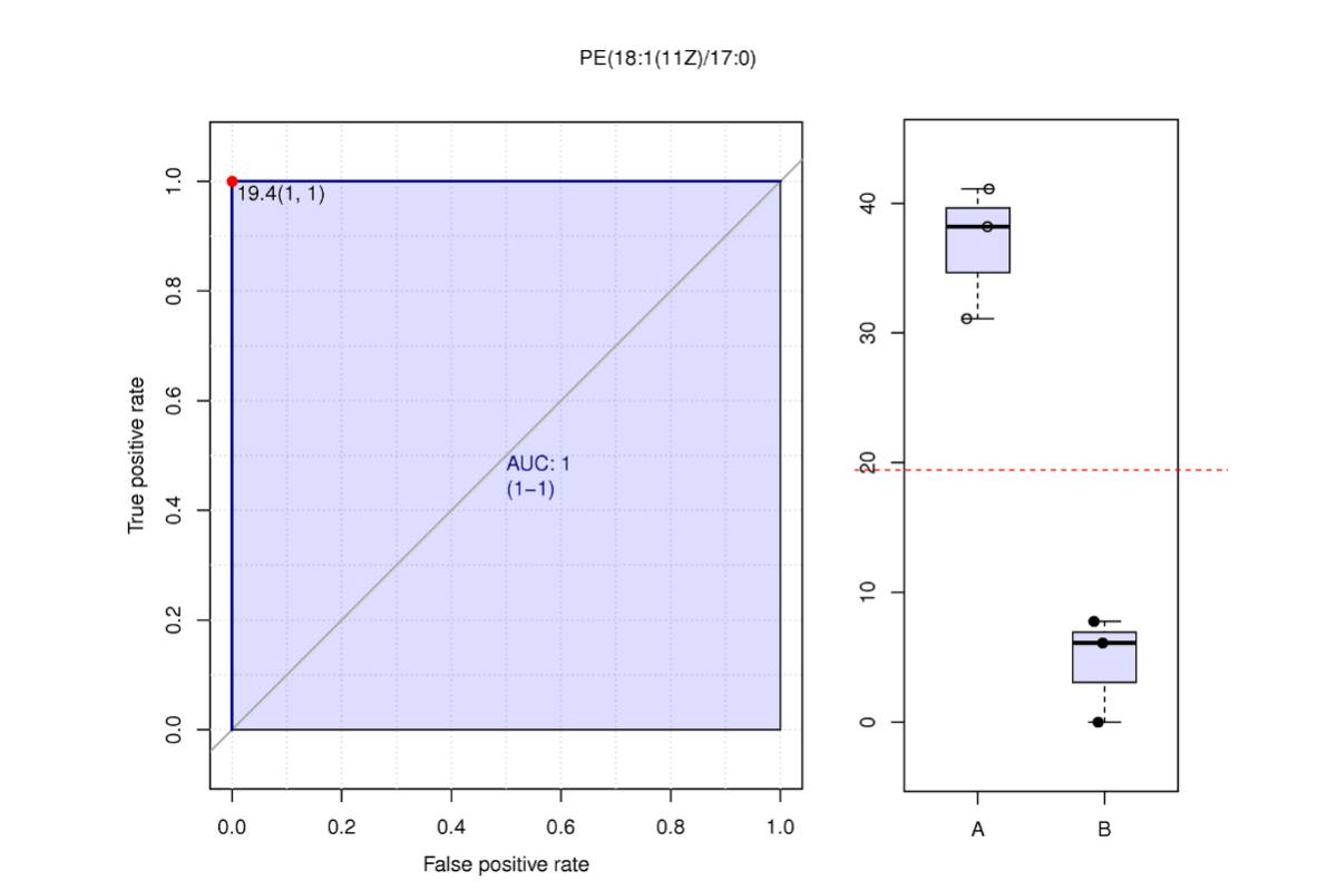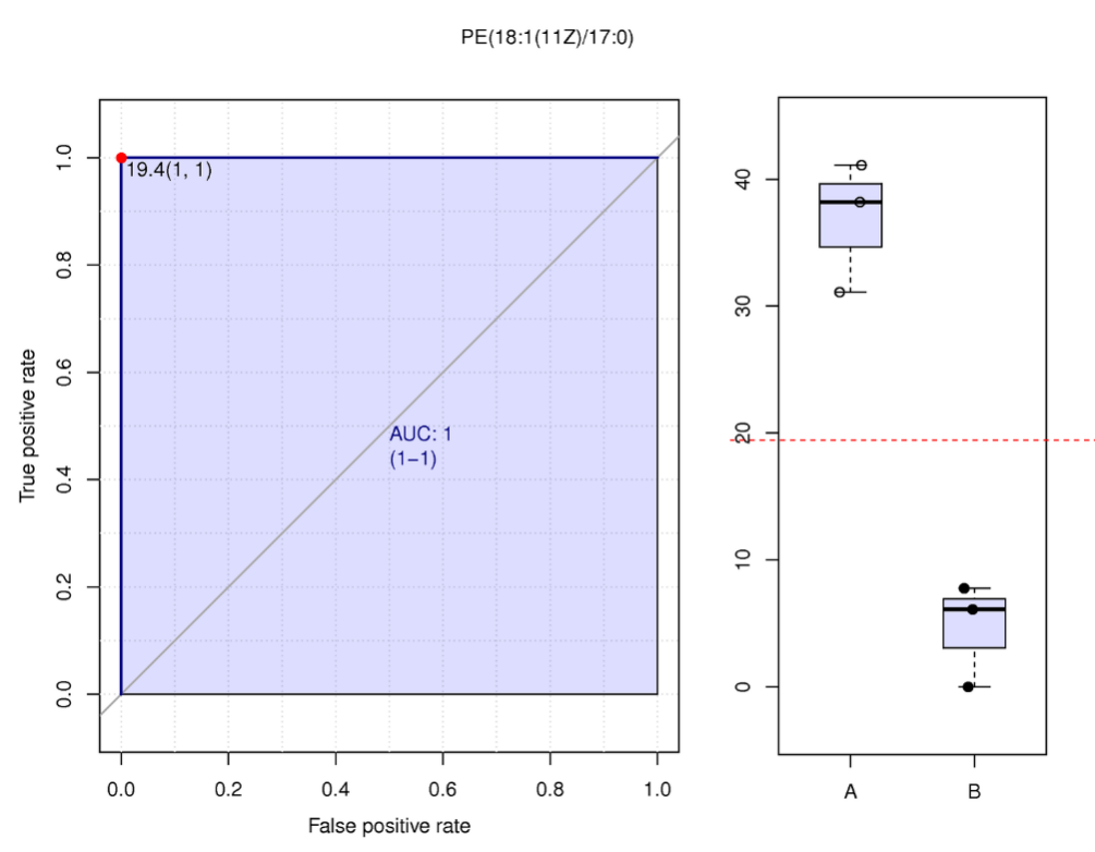 ROC曲線 (receiver operating characteristic curve) 是一種常用來篩選評估生物標(biāo)記物的分析方法[9]。AUC (Area under the curve) 是衡量ROC曲線非常有用的度量。AUC始終在0.5(兩個類在統(tǒng)計上相同)和1.0(有一個閾值可以實(shí)現(xiàn)類之間的完美分離)之間,越接近1,物質(zhì)的在對照組和實(shí)驗(yàn)組的分離就越明顯(即為潛在的生物標(biāo)記物)。一般來說,組內(nèi)生物學(xué)重復(fù)>15時,ROC曲線才有足夠的點(diǎn)繪制折線,才會體現(xiàn)出較大意義。對篩選出的各組差異代謝物單獨(dú)進(jìn)行ROC分析。