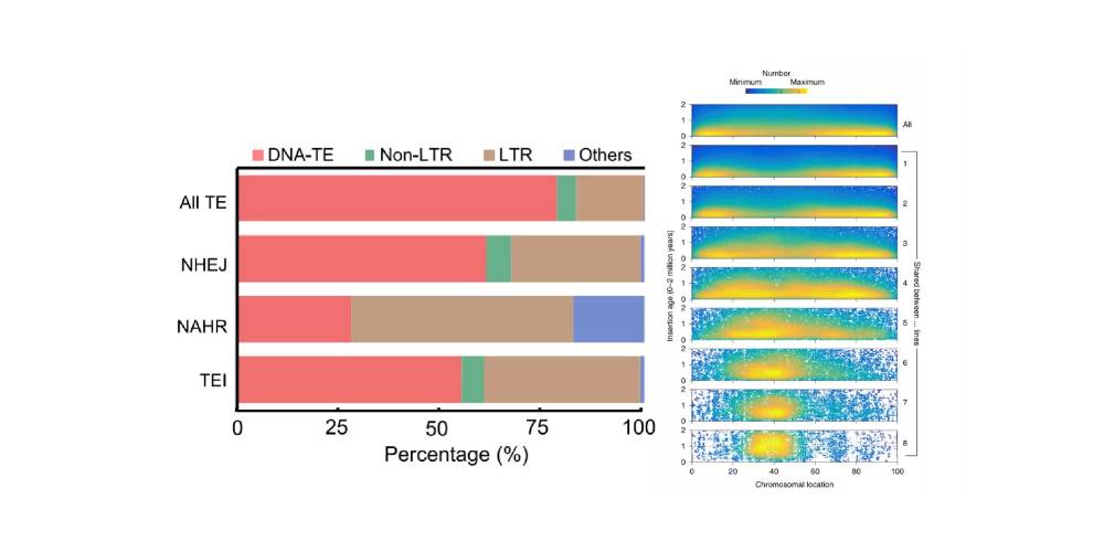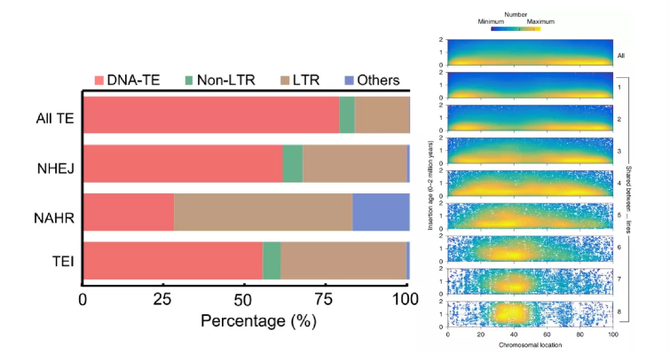 水稻中TEs,尤其是LTRs促進非等位同源重組(Qin P et al.,Cell.2021);玉米泛基因組中隨著個體的增加,LTR插入呈現(xiàn)向中心富集,并與插入時間的增加相關(guān)。