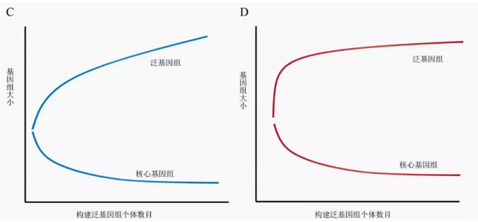 廣義的泛基因組是指獲取該物種全部遺傳信息,構(gòu)建一個非冗余的集合體。由于個體間的差異,在構(gòu)建泛基因組的時候會在參考基因組的基礎(chǔ)上,不斷引入新的特異性序列。因此,統(tǒng)計結(jié)果可發(fā)現(xiàn)整個泛基因組的大小隨著個體數(shù)量的增加而增加,核心基因組(幾乎存在與全部個體基因組中)的大小隨著個體數(shù)量的增加而減小(如圖1)。