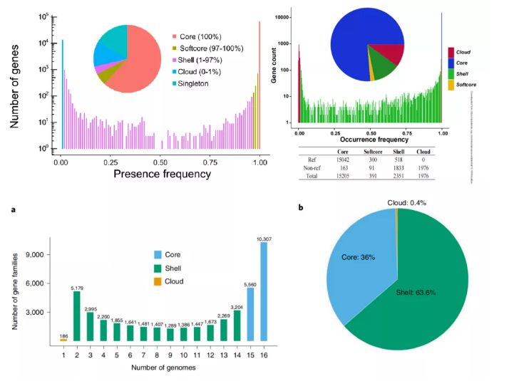 隨著基因組數(shù)量的增加,核心基因的識別將嚴(yán)重受到denovo中組裝錯誤的影響。為了糾正這種錯誤,一些科研工作者將泛基因組進一步細分:在所有基因組的為核心基因(core),在幾乎所有品系中發(fā)現(xiàn)的為soft-core,在比soft-core少但不止幾個品系的品系中發(fā)現(xiàn)的shell,以及在只有幾個品系中發(fā)現(xiàn)的為cloud。具體的分類比例與樣品數(shù)量間的關(guān)系并不固定,目的均是為了對基因進行分組,以便進行可靠的比較(圖3)。而這些分組的基因頻率呈現(xiàn)不對稱的首尾高中間低的分布形式,充分展示了不同類別基因型的占比情況。
