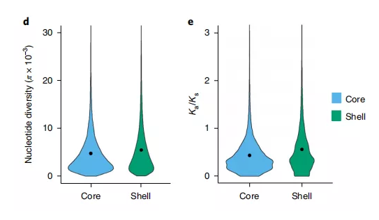 眾多研究表明,非核心基因比核心基因的可變性更強;與核心基因集相比,非核心基因集中的非同義突變比同義突變的比率要高。因此通過同義與非同義突變(ka/ks)可以用來檢測非核心基因集中基因是否受到選擇作用。