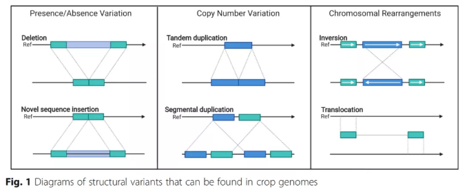 結(jié)構(gòu)變異是泛基因組的重點研究對象,這些變異信息為物種的人為選擇及自然選擇提供原始的材料。了解變異產(chǎn)生的過程,探究不同材料的變異程度并利用有利的變異對維持并提高物種生產(chǎn)力至關(guān)重要,有助于解析物種表型和農(nóng)藝性狀的多樣性。泛基因組研究,為更好地了解SV在動植物馴化中的作用提供了基礎(chǔ)。主要研究的變異類型為:SNP(Single nucleotide polymorphism),即單核苷酸多態(tài)性變異,主要指在基因組水平上由單個核苷酸的變異所引起的DNA序列多態(tài)性,這種變異可由單個堿基的轉(zhuǎn)換(transition)或顛換(transversion)所引起。InDel(Insertion-Deletion),指的是在基因組的某個位置上所發(fā)生的小片段序列的插入或者刪除,其長度通常在在 2 bp-50 bp 之間。SV(Structure Variantions),即基因組結(jié)構(gòu)性變異,通常指的是基因組上大長度的序列變化和位置關(guān)系變化,有豐富的變異類型,包括長度在50bp以上的長片段染色體倒位、染色體易位、重復(fù)、存在/缺失(PAV)、拷貝數(shù)變異(CNV)。