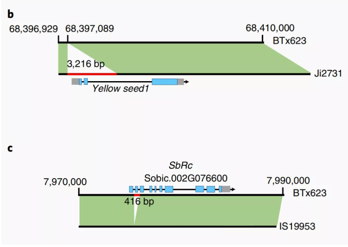 例如高粱泛基因組研究發(fā)現(xiàn),相對于參考基因組,其它高粱個體基因組中有429~1118個基因存在拷貝數(shù)變異(CNV)。功能注釋顯示這些CNV基因豐富了防御反應(yīng)、信號轉(zhuǎn)導(dǎo)和細胞蛋白分解代謝等生物學(xué)過程。并且不同高粱個體基因組上存在大量的存在缺失變異(PAV),有2514個基因受PAV嚴(yán)重影響,這些基因富集于與生物和非生物脅迫相關(guān)的生物過程,而抗病基因在這組基因中顯著富集。進一步研究發(fā)現(xiàn)Yellow seed1、SbRc的PAV影響到高粱籽粒顏色變化(圖9)