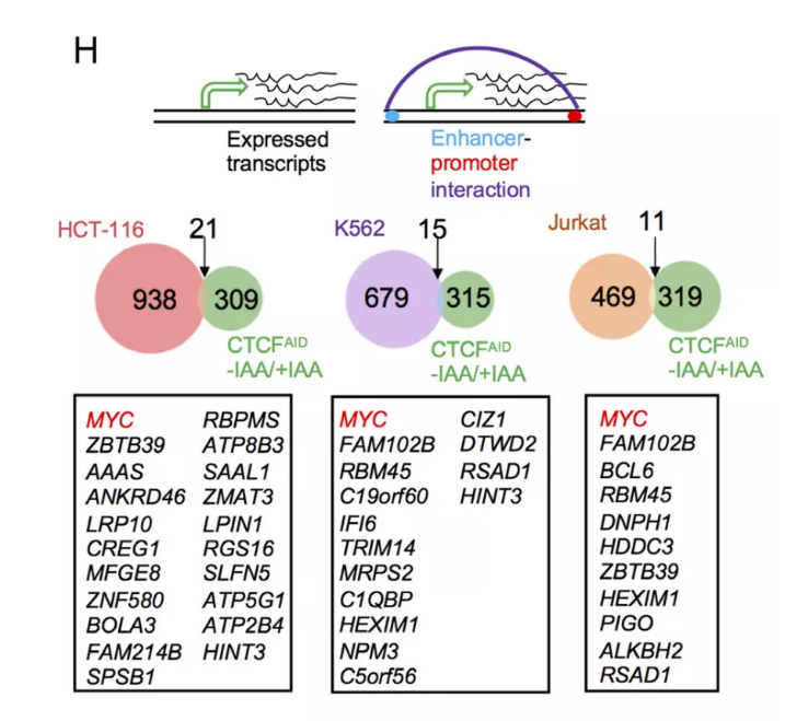 CTCF基因啟動(dòng)子的染色質(zhì)可及性在CTCF耗竭時(shí)也有所增加(圖3D),這一點(diǎn)通過(guò)定量PCR (Q-PCR)進(jìn)一步得到驗(yàn)證(圖3E)。這些數(shù)據(jù)表明CTCF可以抑制自身以保持最*表達(dá)水平。對(duì)于CTCF耗竭后被下調(diào)的基因,如MYC,并沒(méi)有在啟動(dòng)子區(qū)域檢測(cè)到有統(tǒng)計(jì)學(xué)意義的染色質(zhì)可及性變化。因此,當(dāng)啟動(dòng)子區(qū)域保持開(kāi)放時(shí),遠(yuǎn)端增強(qiáng)子區(qū)域的染色質(zhì)景觀變得更難以接近,再加上CTCF耗竭,可能在控制能調(diào)控MYC轉(zhuǎn)錄的遠(yuǎn)端增強(qiáng)子-啟動(dòng)子loop環(huán)的形成中發(fā)揮作用。