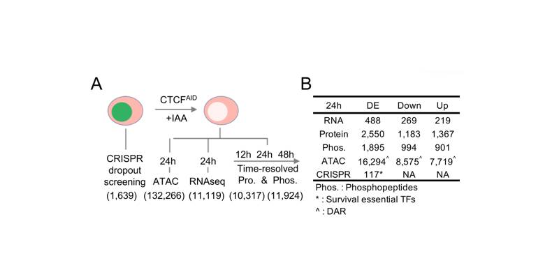 CCCTC-結(jié)合因子(CTCF)是一種高度保守的含鋅指轉(zhuǎn)錄因子,被稱為“基因組編織大師”。它是研究最廣泛的三維(3D)染色質(zhì)結(jié)構(gòu)調(diào)控因子。研究發(fā)現(xiàn)在CTCF急性衰竭細(xì)胞模型和其他基因敲除模型中,CTCF在全基因組TAD和TAD內(nèi)部loop環(huán)的形成中是不可或缺的。為了更好地理解CTCF結(jié)合占用率如何促進(jìn)轉(zhuǎn)錄調(diào)控,本文系統(tǒng)地進(jìn)行了多組學(xué)研究,特別關(guān)注染色質(zhì)可及性。通過(guò)系統(tǒng)整合了ATAC-seq、RNA-seq, WGBS, Hi-C, Cut&Run和CRISPR-Cas9基因篩選技術(shù),以及深度蛋白質(zhì)組學(xué)和磷酸化蛋白質(zhì)組學(xué)分析,用以研究CTCF蛋白急性耗竭對(duì)細(xì)胞的影響。