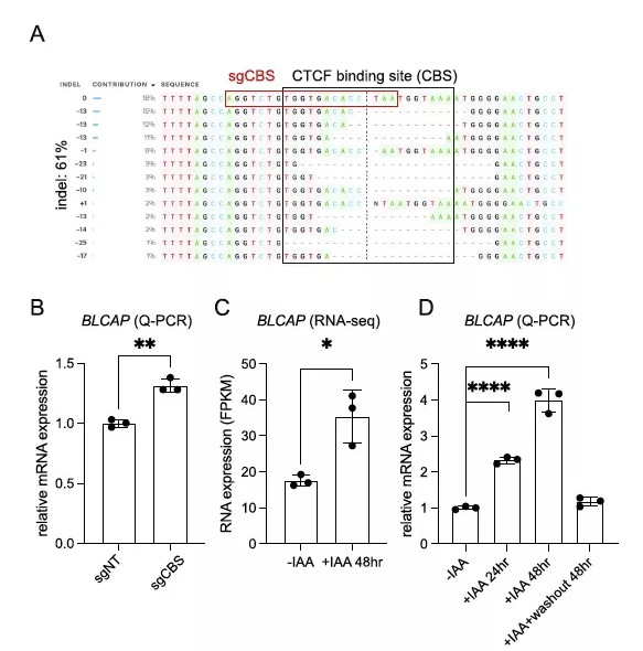 為了進(jìn)一步驗(yàn)證預(yù)測(cè)的假定絕緣子的作用,將慢病毒表達(dá)的引導(dǎo)RNA感染表達(dá)Cas9的SEM細(xì)胞中,然后進(jìn)行抗生素選擇。Sanger基因組測(cè)序(Inference of CRISPR edit, ICE)在目標(biāo)人群中檢測(cè)到約61%的總indel頻率(圖5A),與非靶向?qū)驅(qū)φ战M(sgNT)相比,導(dǎo)致BLCAP mRNA表達(dá)顯著增加(圖5B)。用IAA處理CTCFAID細(xì)胞24和48小時(shí),然后洗脫IAA進(jìn)行CTCF修復(fù)。通過(guò)RNA-seq分析和Q-PCR驗(yàn)證,驗(yàn)證急性CTCF蛋白耗竭時(shí)BLCAP mRNA的表達(dá)(圖5C)。不出所料,生長(zhǎng)素處理24或48 h后CTCF蛋白急性耗竭,BLCAP表達(dá)水平顯著升高。更重要的是,洗脫生長(zhǎng)素后,其表達(dá)水平恢復(fù)到親本細(xì)胞的水平(圖5D)。綜上所述,這些數(shù)據(jù)有力地支持了CTCF在BLCAP調(diào)控區(qū)域的占用充當(dāng)了控制BLCAP表達(dá)的功能絕緣體。