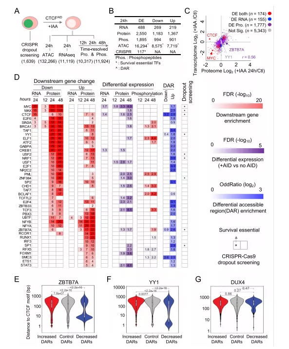 本文開(kāi)發(fā)了一種多組學(xué)聯(lián)合的方法來(lái)定義CTCF共調(diào)控轉(zhuǎn)錄因子,總共鑒定了40個(gè)CTCF共同調(diào)控因子,這些TF在急性CTCF耗竭時(shí)在mRNA和/或蛋白質(zhì)水平上顯著影響其下游靶基因的表達(dá)(圖6D)。正如預(yù)期的那樣,這40個(gè)CTCF共調(diào)控因子中的大多數(shù)也在CTCF介導(dǎo)的DARs中有共同定位,證實(shí)了它們與CTCF有著潛在的直接共同調(diào)控作用。