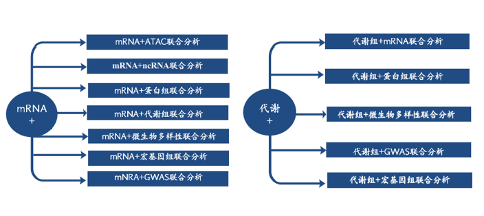 中心法則是遺傳的基礎,在中心法則中,RNA處于重要的中央樞紐地位,轉錄組作為生信科研中的“萬金油”,最大的特點就是“短平快”,是功能基因的研究利器,是利用率最高,最成熟的測序手段,在多組學聯(lián)合中扮演中重要的角色。代謝組是表型的直接體現(xiàn)者,“代謝組+ ”研究模式已經(jīng)在多個領域廣泛使用,成為深入研究科學問題,系統(tǒng)闡釋作用機制的利器。以下就是常見的基于這兩個組學的聯(lián)合分析策略。