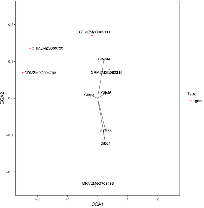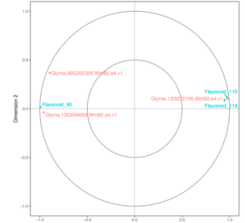 典型相關分析(canonical correlation analysis, CCA),是利用綜合變量對之間的相關關系來反映兩組指標之間的整體相關性的多元統(tǒng)計分析方法。對相關性網(wǎng)絡圖中的差異基因及差異代謝物進行典型相關分析,圖中以十字區(qū)分出四個區(qū)域,在同一個區(qū)域內(nèi),距原點越遠關聯(lián)性越高,在同一個象限內(nèi)距離較近的代謝物和基因之間相關聯(lián)的程度高,基于此結果可進一步挖掘和代謝物最相關的基因。