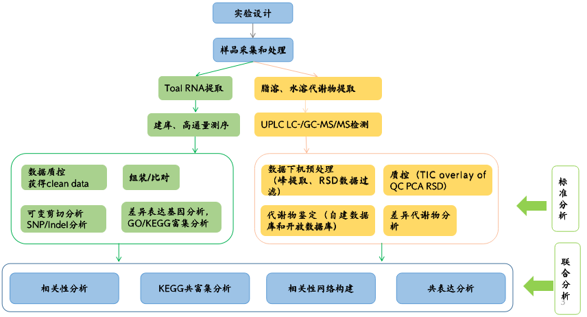 代謝與轉錄組聯(lián)合分析是基于兩個組學各自的標準分析結果,將差異代謝物和差異基因在代謝通路上的注釋結果進行關聯(lián)分析,可以在代謝通路上更好地解釋轉錄調(diào)控機制。常規(guī)的聯(lián)合分析內(nèi)容主要包括代謝組和轉錄組KEGG通路分析、KEGG共富集分析、相關性分析、差異基因和差異代謝物趨勢分析、典型相關性分析、限制性對應分析等內(nèi)容。