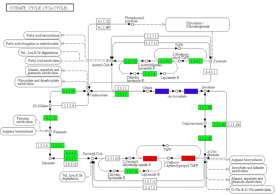 差異代謝物分析結果結合轉錄組差異基因分析結果,將相同分組的差異基因及差異代謝物同時映射到KEGG通路圖上,用綠色和紅色標注基因或代謝物表達量顯著下調(diào)或上調(diào)的節(jié)點,藍色標注既有上調(diào)又有下調(diào)的基因,更好的了解基因與代謝物之間的關系。