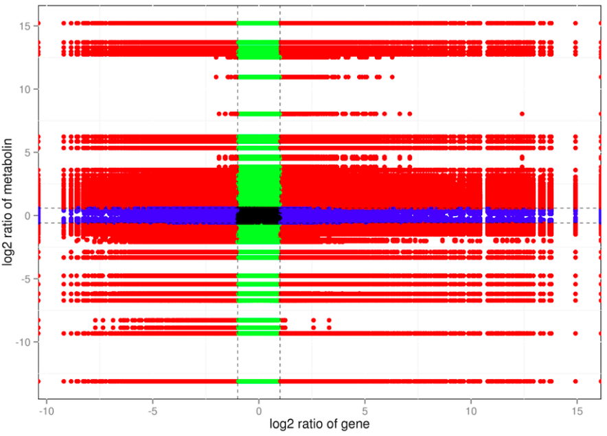 將不同差異分組基于皮爾遜相關性(pearson)方法計算所有基因和代謝物之間的相關性,然后按照相關性系數(shù)(Correlation Coefficient,CC)和相關性的pvalue篩選表達相關性較高的基因和代謝物。并利用九象限圖對于篩選后的基因和代謝物的表達趨勢進行分析,例如基因和代謝物表達趨勢一致或相反,表明基因可能是正向或者負向調(diào)控代謝物,或者基因/代謝物表達發(fā)生變化,但是對應的代謝物/基因表達不變,則說明還有其他的調(diào)控機制參與到整個代謝通路中。